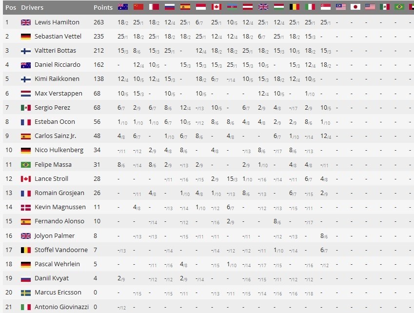 در حال حاضر لوئیس همیلتون با 263 امتیاز، سباستین فتل با 235 امتیاز و واتری بوتاس با 2015 امتیاز، مکانهای اول تا سوم جدول رده بندی را در اختیار دارند.