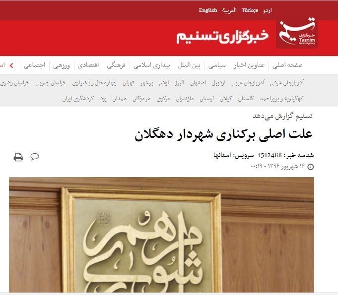 خبرگزاری بین‌المللی تسنیم در استان کردستان (شانزدهم شهریورماه) از علت اصلی برکناری شهردار و نحوه انتخاب سرپرست شهردار جدید دهگلان گزارش و اظهارات اعضای شورای شهر را منعکس کرد.