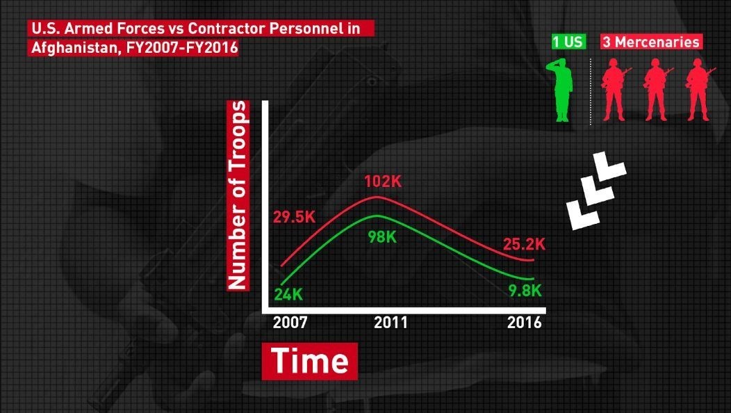 خط سبز نشانگر شمار نظامیان آمریکایی و خط قرمز تعداد سربازان اجیر در افغانستان را نشان میدهد؛ در سال 2016، شمار سربزان اجیر در این کشور 3 برابر تعداد نظامیان ارتش آمریکا بوده است.
