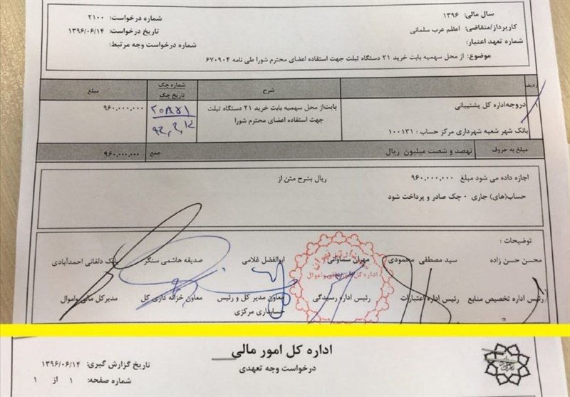 به گزارش خبرنگار اجتماعی خبرگزاری تسنیم، معاونت امور مالی و اجرایی شورای شهر تهران اقدام به خرید 21 عدد  تبلت‌ 4 میلیون و 570 هزار تومانی و 21 دستگاه  پژوپارس‌ 42 میلیون و 300 هزار تومانی برای اعضای شورای شهر تهران کرده است. هزینه‌ای که برای این موضوع صرف شده حدود یک میلیارد تومان است.