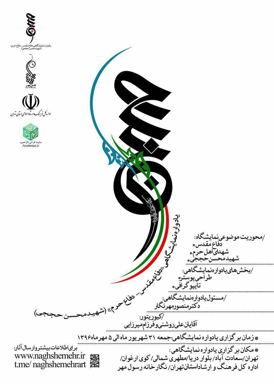به گزارش خبرنگار فرهنگی باشگاه خبرنگاران پویا، به منظور ادای دین جامعه هنری در عرصه گرافیک ایران به شهدای دفاع مقدس، شهدای مدافعان حرم و شهادت مظلومانه شهید مدافع اهل حرم، «محسن حججی»، نشان فرهنگی، هنری و پژوهشی «نقش مهر» با همکاری اداره فرهنگ و ارشاد اسلامی شهر تهران و سایت قرانی «الرحمن» یادواره نمایشگاهی «دفاع مقدس- دفاع حرم» را برگزار میشود.