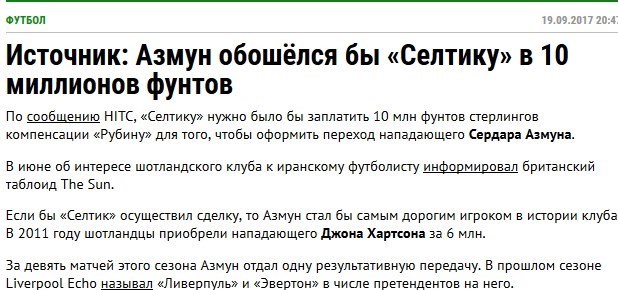به گزارش خبرگزاری تسنیم، روزنامه بیزنس روسیه به نقل از سایت HITC نوشت: باشگاه سلتیک اسکاتلند باید مبلغ 10 میلیون پوند به روبین‌کازان پرداخت می‌کرد تا انتقال سردار آزمون، مهاجم ایرانی به این تیم عملی شود.