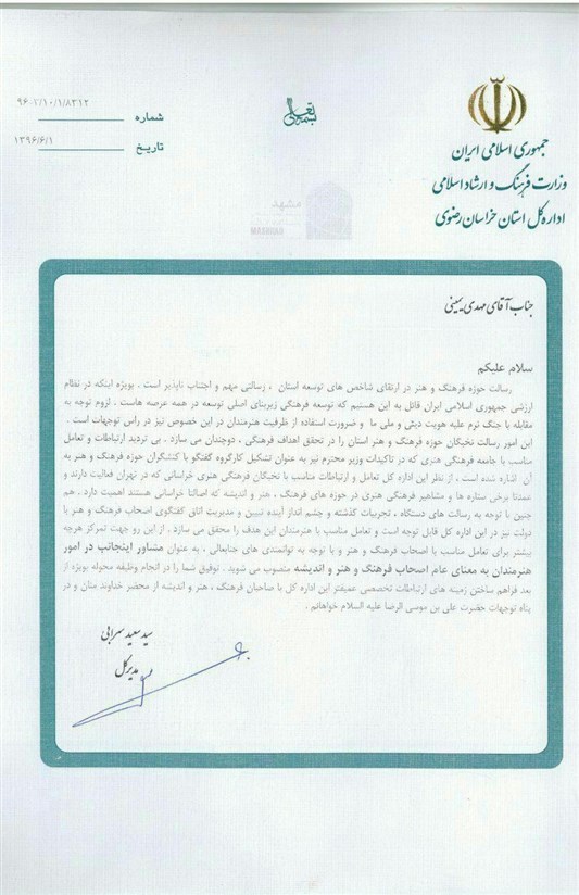 به گزارش خبرگزاری تسنیم از مشهدمقدس، سیدسعید سرابی در حکم انتصاب یمینی، با تاکید برضرورت افزایش تعامل دولت با اصحاب فرهنگ و هنر و ارتباطات تخصصی عمیقتر وزارت فرهنگ و ارشاد اسلامی با هنرمندان آورده است: "ارتباطات وتعامل مناسب با جامعهی فرهنگی هنری که در تاکیدات وزیر محترم بهعنوان تشکیل کارگروه گفتوگو با کنشگران حوزه فرهنگ وهنر به آن اشاره شده است، از نظر این ادارهکل تعامل وارتباطات مناسب با نخبگان فرهنگی هنری خراسانی که درتهران فعالیت دارند و عمدتا برخی ستارهها و مشاهیر فرهنگی هنری درحوزههای فرهنگ، هنر و اندیشه که اصالتاً خراسانیاند، اهمیت دارد. همچنین تبیین و مدیریت اطاق گفتوگوی اصحاب فرهنگ و هنر با دولت، نیز در این ادارهکل قابل توجه است."
