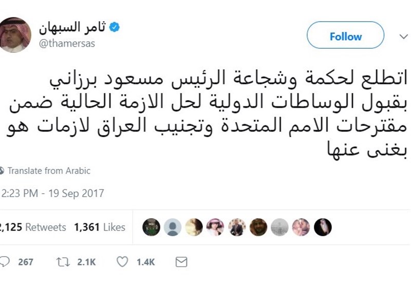 به گزارش گروه بینالملل خبرگزاری تسنیم،ثامر السبهان، وزیر امور کشورهای خلیج فارس عربستان، روز سهشنبه در صفحه خود بر روی توییتر از مسعود بارزانی رئیس اقلیم کردستان عراق خواست که میانجیگری سازمان ملل برای حل مشکلات این اقلیم با بغداد را قبول کند.