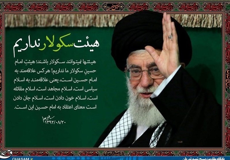 «هیئتها نمیتوانند سکولار باشند؛ هیئتِ امام حسینِ سکولار ما نداریم. هرکس علاقهمند به امام حسین است، یعنی علاقهمند به اسلام سیاسی است، اسلام مجاهد است، اسلام مقاتله است، اسلام خون دادن است، اسلام جان دادن است؛ معنای اعتقاد به امام حسین این است. اینکه آدم در یک مجلس روضه یا هیئت عزاداری مراقب باشد که مبادا وارد مباحث اسلام سیاسی بشود، این غلط است. البتّه معنای این حرف این نیست که هر حادثه سیاسی در کشور اتّفاق میافتد، ما باید حتماً در مجلس روضه آن را با یک گرایش خاصّی - حالا یا این طرف، یا آن طرف - بیان کنیم و احیاناً با یک چیزهایی هم همراه باشد؛ نه، اما فکر انقلاب، فکر اسلام، خطّ مبارکی که امام (رضوان الله علیه) در این مملکت ترسیم کردند و باقی گذاشتند، اینها بایستی در مجموعهها و مانند اینها حضور داشته باشد.»