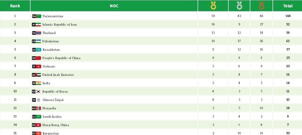 به گزارش خبرنگار اعزامی خبرگزاری تسنیم از ترکمنستان، ششمین روز از پنجمین دوره بازیهای داخل سالن آسیا در حالی به پایان رسید که کاروان کشورمان موفق به کسب 6 طلا، 3 نقره و 4 برنز شد و در مجموع با کسب 16طلا، 9 نقره و 27 برنز در رده دوم جدول مدالی باقی ماند.
