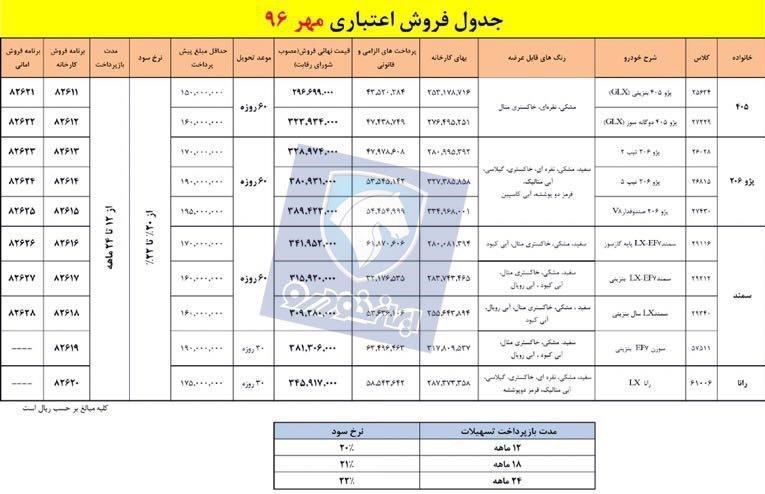 این محصولات در رنگ های متنوع عرضه می شوند و موعد تحویل پژوهای 406 و 206 و سه مدل از محصولات سمند 60 روزه است. تحویل سمند ای.اف.7 بنزینی و محصول رانا 30 روزه پیش بینی شده است.