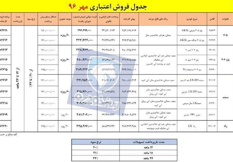 میزان پیش پرداخت برای خرید اعتباری این محصولات شرکت ایران خودرو حدود 50درصد قیمت نهائی است و مبلغ باقیمانده نیز با نرخ سود 20 تا 22درصد در مدت 12 تا 24ماه دریافت خواهد شد.