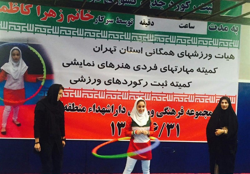 سکینه دادخواه نائب رئیس کمیته ثبت رکوردهای کشوری از فدراسیون ورزشهای همگانی در گفتوگو با خبرنگار تسنیم در استان تهران اظهار داشت: زهرا کاظمی دختر جوان ورزشکار تهرانی که 20 سال سن دارد، موفق شد رکورد حلقه زدن دور کمر (هولاهوپ) را بهصورت متوالی و بدون خطا بهمدت زمان 12 ساعت و 12 دقیقه و 12 ثانیه در سطح ملی به ثبت برساند.