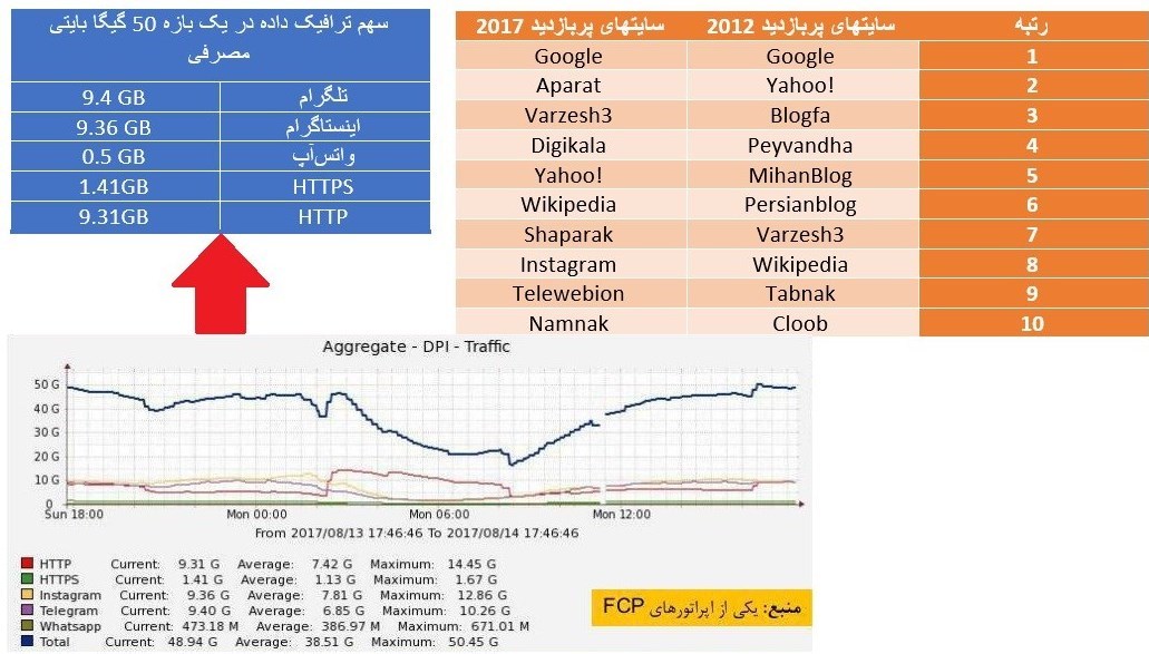 به گزارش خبرنگار فناوری اطلاعات و ارتباطات خبرگزاری تسنیم، سهم ترافیک داده در یک بازه 50 گیگابایت مصرفی که در یک روز سنجیده شده نشان از میزان و علاقه کاربران به بخشهایی خاص دارد که بیشتر ترافیک شبکه یکی از اپراتورهای ارتباطات ثبات (FCP) را به سمت خود کشیده است.