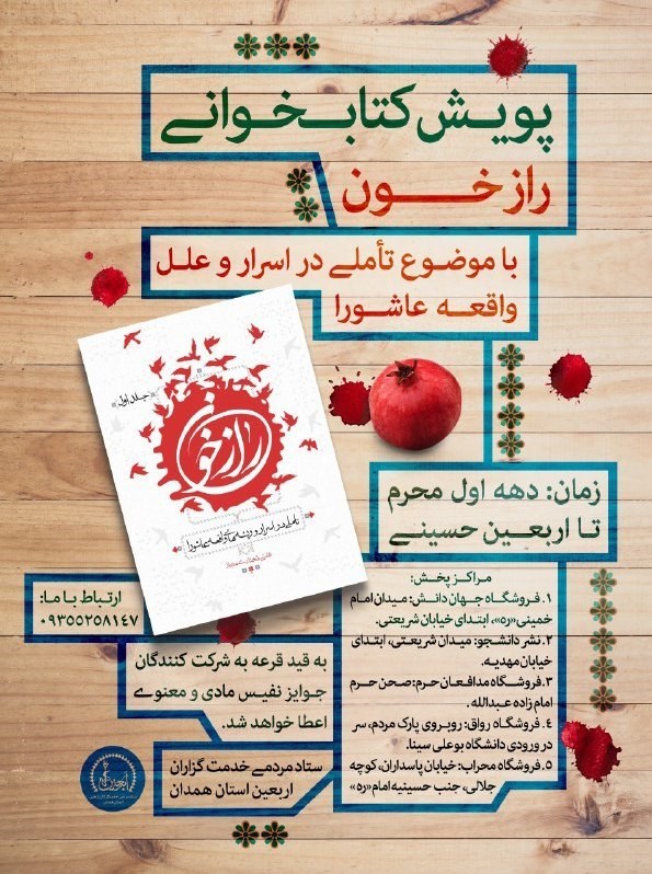 به گزارش خبرگزاری تسنیم از همدان، پویش و مسابقه کتابخوانی "راز خون" اثری از "علی مختاری مجاز"به همت ستاد مردمی خدمتگزاران اربعین استان همدان همزمان با دهه اول محرم آغاز شده و تا اربعین حسینی نیز ادامه مییابد.علاقمندان میتوانند این کتاب را به صورت نیمبها از غرفههای برپا شده در هیأتهای مذهبی بزرگ شهر و غرفههای مستقر در نماز جمعه سراسر استان همدان تهیه کنند.