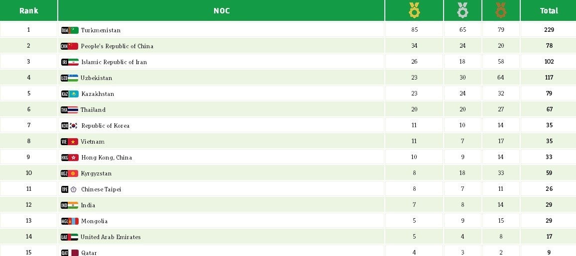 در جدول مدالی تیم ترکمنستان با 85 طلا، 65 نقره و 79 برنز و مجموع 229 مدال همچنان در صدر قرار دارد، چین با 34طلا، 24 نقره و 20 برنز و مجموع 78 مدال دوم است و ایران نیز در رده سوم قرار گرفته است.