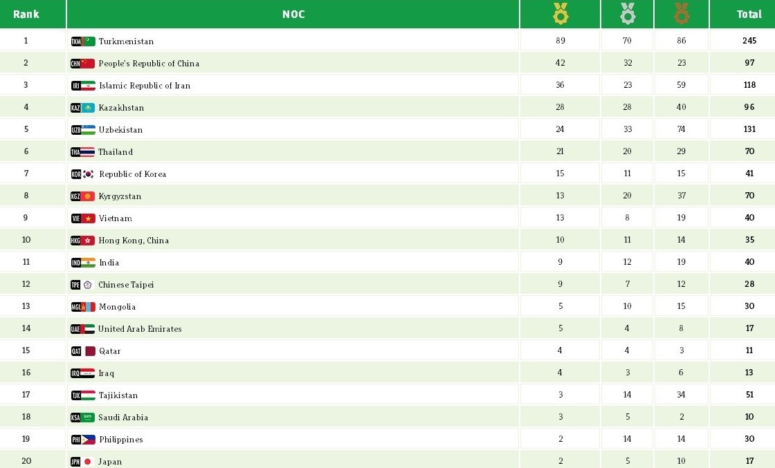 کاروان ترکمنستان به عنوان کشور میزبان با 497 ورزشکار حضور داشت و موفق به کسب 89 طلا، 70 نقره و 86 برنز و مجموع 245 مدال شد. این کشور در حالی در رتبه اول قرار گرفت که در بازیهای آسیایی 2014 اینچئون تنها با 80 ورزشکار شرکت کرده، فقط یک نقره و 5 برنز به دست آورده و در رده سی و یکم نیز قرار گرفته بود.