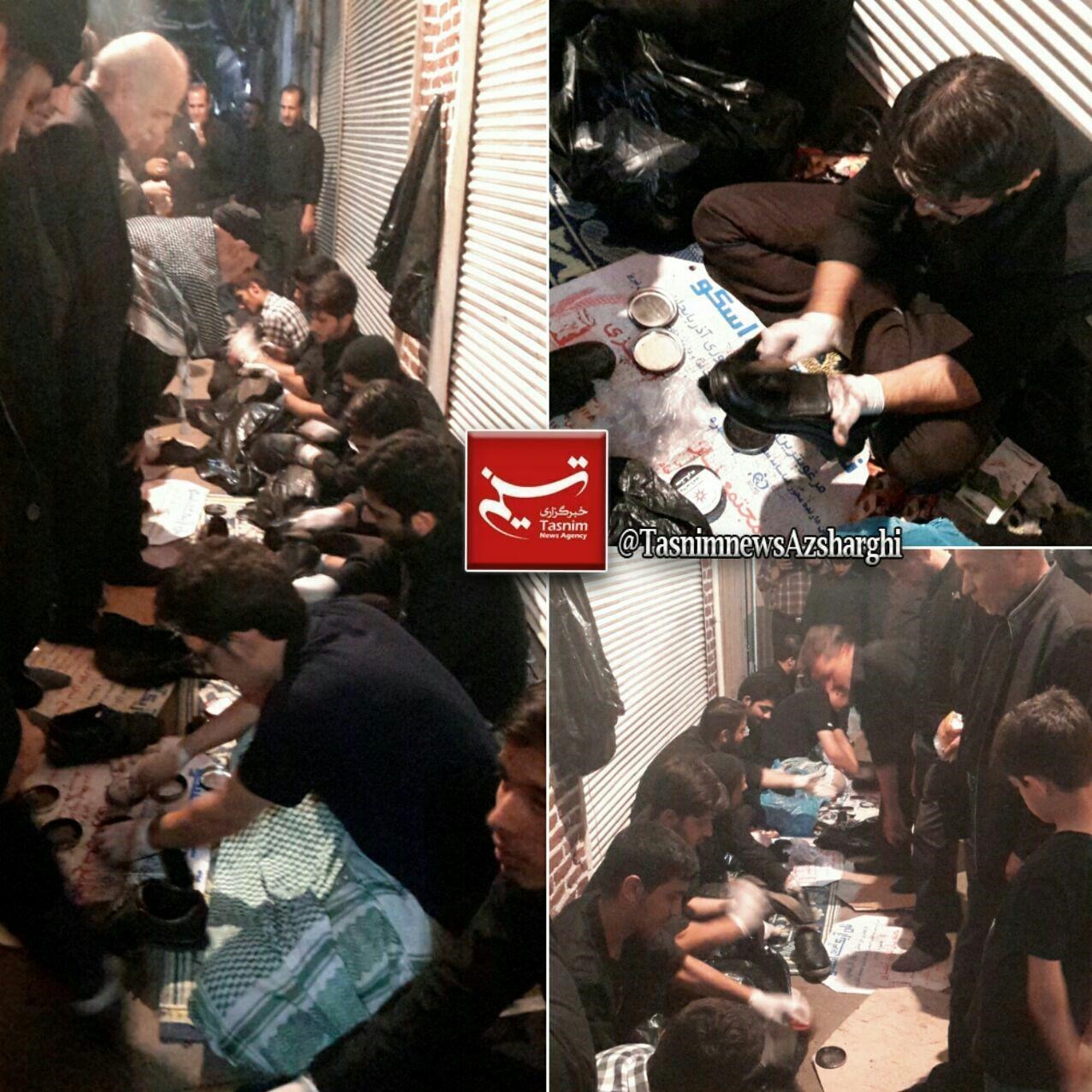 از همین رو تعدادی از جوانان تبریزی در اقدامی جالب به صورت خودجوش کفشهای عزاداران بازار و میدان صاحبالامر تبریز را برای ادای نذر خود واکس زدند و ضمن خدمت به مردم، عشق و ارادت خود را به امام حسین (ع) نشان میدهد.