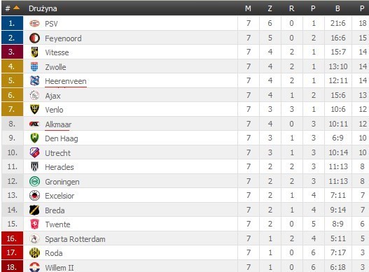 در جدول ردهبندی اردویژه هلند تا پایان هفته هفتم تیم پیاسوی آیندهوون با 18 امتیاز صدرنشین است. تیمهای هیرنوین و آلکمار نیز به ترتیب با امتیازهای 14 و 12 رتبههای پنجم و هشتم را در اختیار دارند.
