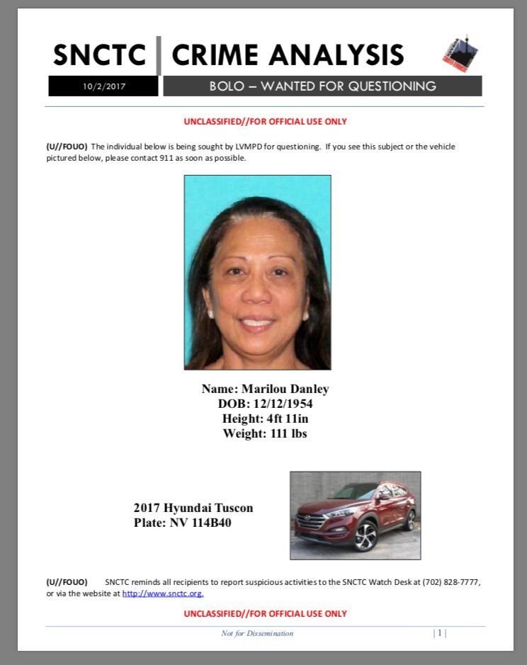 این در حالی است که پلیس لاس وگاس با انتشار تصاویری از یک زن به نام «ماریلو دانلی» (Marilou Danley) و عمومی کردن مشخصات وی از مردم خواست که در شناسایی وی به پلیس کمک کنند.