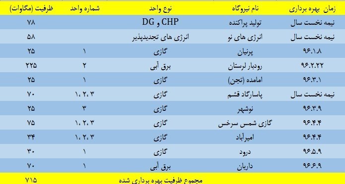 جزئیات افزایش ظرفیت 715 مگاواتی تولید برق کشور در جدول زیر نشان داده شده است.