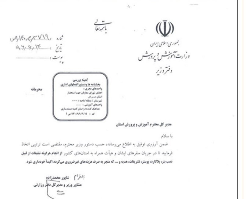 این بخشنامه از طرف «شاپور محمد زاده» مدیرکل دفتر وزارتی در تاریخ 14شهریور96 صادر شده بود که متن کامل و تصویر این بخشنامه در پی می‌آید: