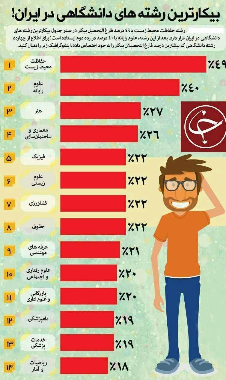رشته حفاظت محیط زیست با 49 درصد، رشته علوم رایانه با 40درصد ،رشته هنر با 27درصد،معماری و ساختمان سازی با 26درصد،رشته فیزیک با 22درصد،رشته علوم زیستی 22درصد،رشته کشاورزی 22درصد،رشته حقوق 22درصد،حرفه های مهندسی 21درصد،علوم اجتماعی و رفتاری 20درصد،بازرگانی و علوم اجتماعی 20درصد،دامپزشکی19درصد،خدمات پزشکی 19درصد،ریاضیات و آمار18درصد به ترتیب بیکارترین رشته های دانشگاهی در ایران است.