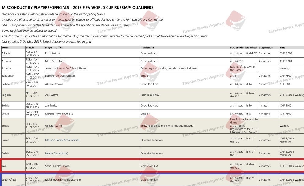 به گزارش خبرگزاری تسنیم، پس از اینکه فدراسیون جهانی فوتبال (فیفا)، سعید عزتاللهی هافبک تیم ملی فوتبال کشورمان را به دلیل رفتار خشونتآمیز در بازی با کره جنوبی در هفته نهم از مرحله پایانی انتخابی جام جهانی 2018 روسیه با دو جلسه محرومیت و جریمه نقدی 5 هزار فرانک سوئیس جریمه کرد، پرسشی به وجود آمده که آیا عزتاللهی دو بازی اول جام جهانی 2018 روسیه را از دست میدهد یا اینکه با سپری کردن یک جلسه اتوماتیک محرومیت خود در بازی مقابل سوریه، تنها بازی اول جام جهانی را از دست خواهد داد.