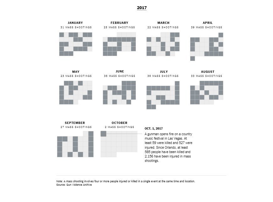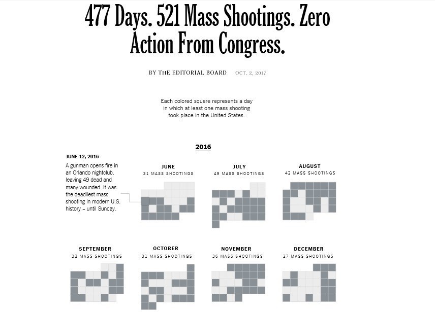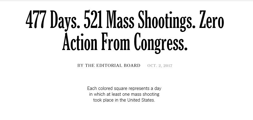بر اساس گزارش نیویورکتایمز، این نمودار نشان میدهد که طی 477 روز گذشته 521 مورد تیراندازی به سوی جمعیت گزارش شده است که واکنش کنگره آمریکا نسبت به تمامی این حوادث عدد صفر را نشان میدهد.