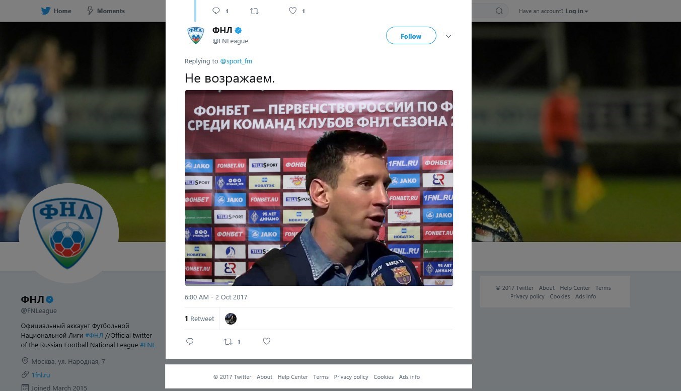 در توییت این باشگاه آمده است: میدانیم که باشگاه بارسلونا ممکن است از لالیگا بیرون برود و لیگش را تغییر دهد. از این رو از باشگاه دعوت میکنیم که به بهترین لیگ دنیا یعنی لیگ ملی روسیه، ملحق شود!