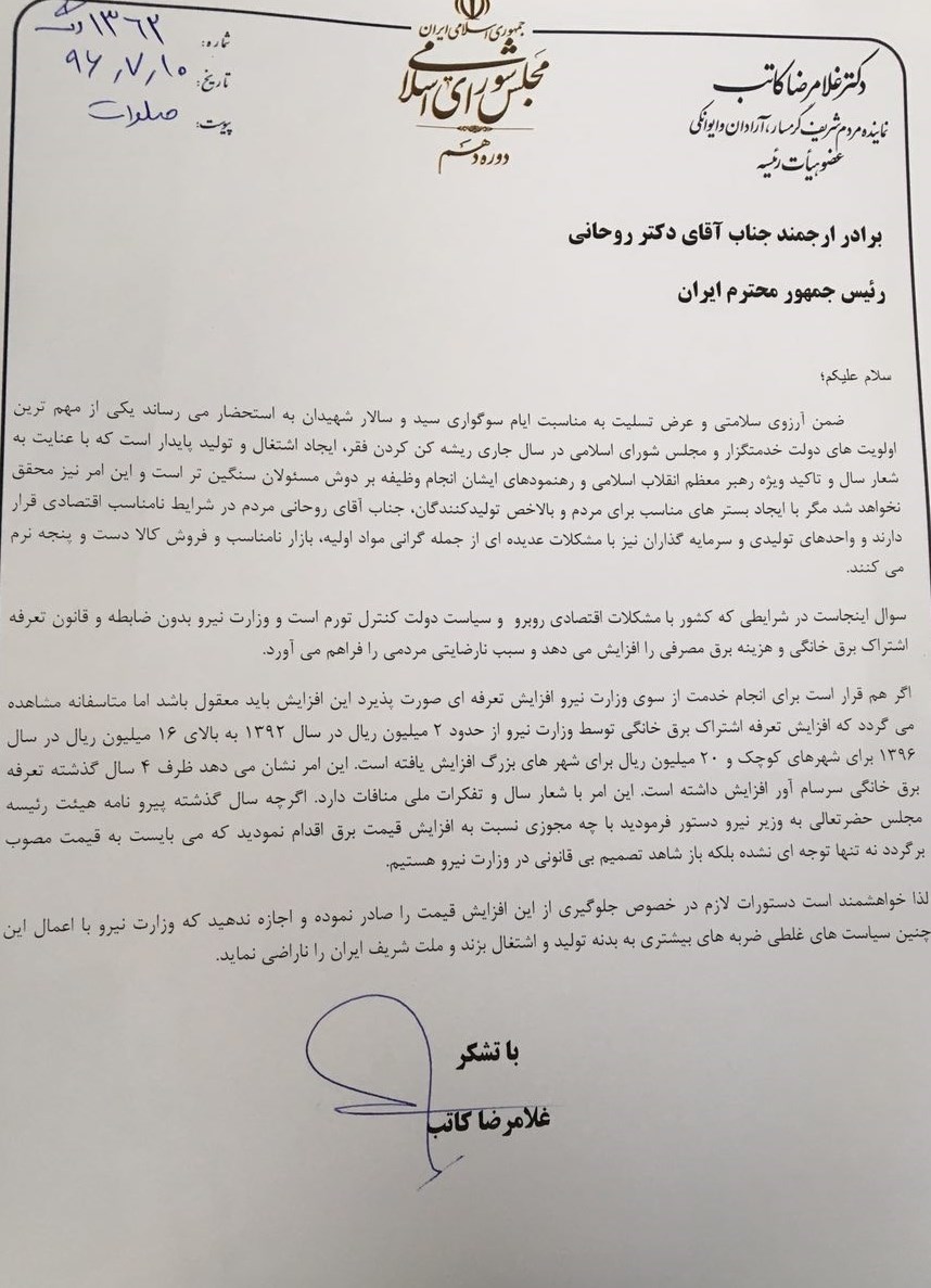 نامه اعتراضی کاتب به رئیسجمهور برای افزایش غیرقانونی حق انشعاب برق