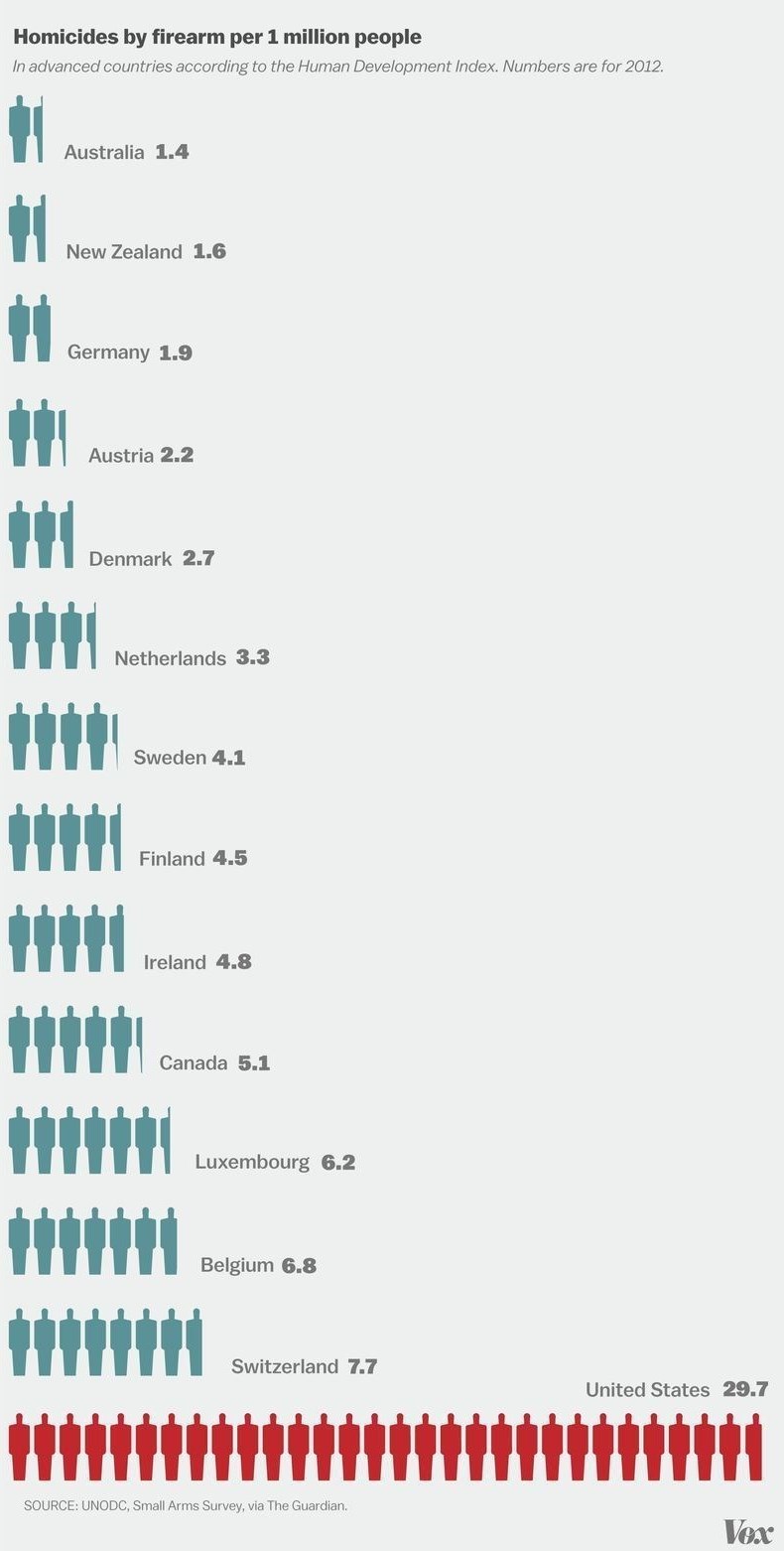 مطابق آمارهایی که وبگاه «ووکس» فراهم کرده آمریکا از حیث فراوانی وقوع خشونت و قتل با اسلحه کشوری بینظیر در دنیا قلمداد میشود. چنانکه در جدول زیر دیده میشود، نرخ وقوع قتل با اسلحه در آمریکا با هیچ کشور دیگری قابل مقایسه نیست و این رقم برای آمریکا 6 برابر بیشتر از کانادا و 16 برابر بیشتر از آلمان است.
