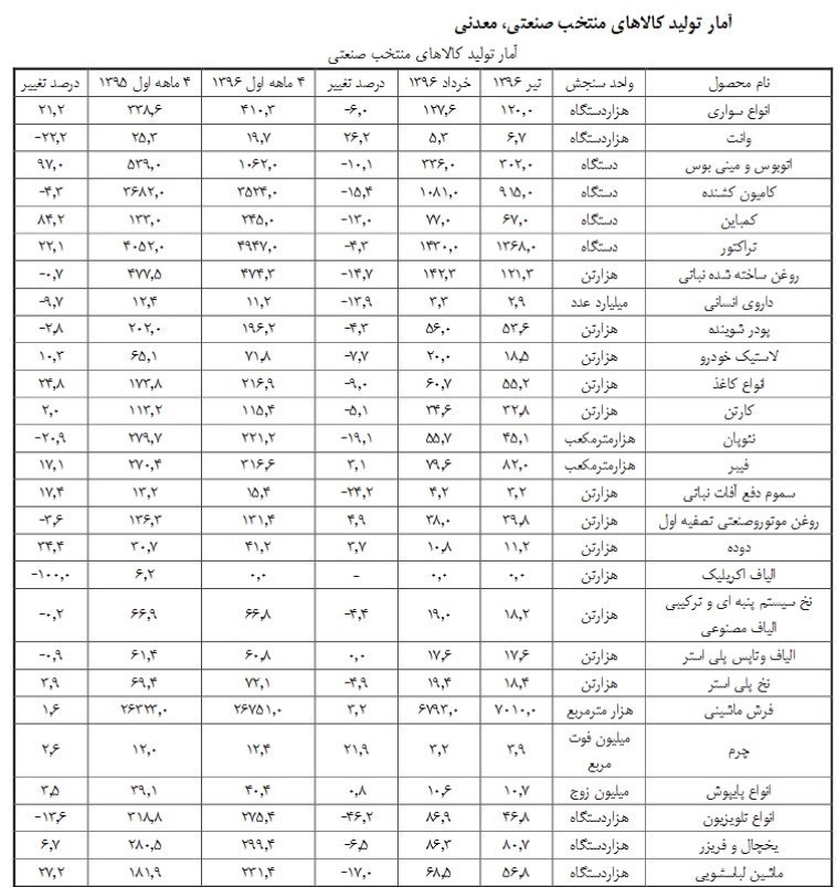 به گزارش خبرنگار اقتصادی خبرگزاری تسنیم، براساس جدیدترین آمار از وضعیت تولید کالاهای منتخب صنعتی، معدنی تا پایان تیرماه امسال از مجموع 29 گروه کالایی تولید حدود 13 کالا از جمله انواع تلویزیون منفی 13.6 درصد، الیاف اکریلیک منفی 100 درصد، کولر آبی منفی 26.9 درصد و وانت منفی 22.2 درصد کاهش داشته است. همچنین در این بازده زمانی تولید انواع کاغذ 24.8 درصد، اتوبوس و مینی بوس 97.1 درصد و ماشین لباسشویی 27.2 درصد افزایش داشته است.