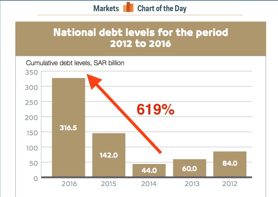 بر اساس گزارشات منعکس شده از سوی رسانه ها، میزان بدهی های عمومی عربستان قریب به 23 درصد رشد یافته و این میزان از افزایش بدهی ها،به مثابه زنگ خطری جدی برای اقتصاد عربستان خواهد بود. بالا رفتن ضریب بدهی های عربستان،ریسک سرمایه گذاری را برای فعالان اقتصادی تشدید خواهد کرد و به تبع در چنین شرایطی ورود و نقش آفرینی سرمایه گذاران در این کشور عربی را با ملاحظاتی جدی ،مواجه خواهد ساخت. طبق اعلام وزارت اقتصاد عربستان بدهی ملی این کشور در سال 2016 به 316 میلیارد ریال(حدود 3/12 درصد از تولید ناخالص ملی) رسیده است. این در حالی است که این میزان در سال 2012، 145 میلیارد ریال بوده است.