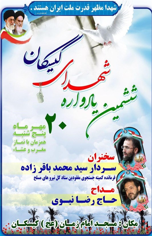 وی با بیان اینکه یک شهید مفقودالاجسد به نام شهید شاهرخ حمزهآی اهل روستای جهانجان در منطقه کیسکان وجود دارد که هنوز خانواده آن چشم انتظار حضور شهید هستند افزود: ششمین یادواره شهدای والامقام دهستان کیسکان در مرکز دهستان در مسجد امام زمان(عج) برگزار میشود.