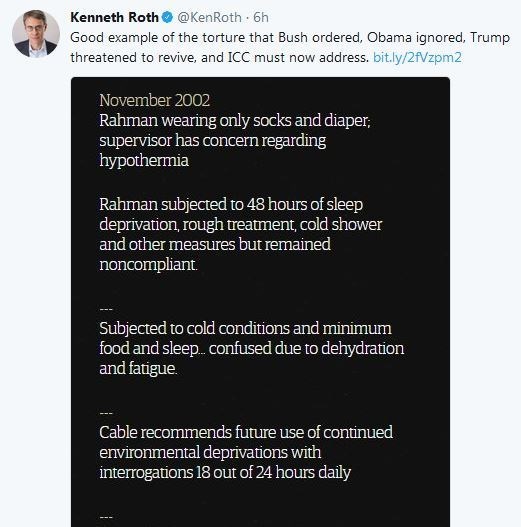 این گزارش نمونه خوبی از شکنجهای است که بوش دستور آن را داد، اوباما آن را نادیده گرفت و ترامپ نیز در صدد احیای آن است، آنچه که باید سازمان بینالمللی لاهه به آن رسیدگی کند.