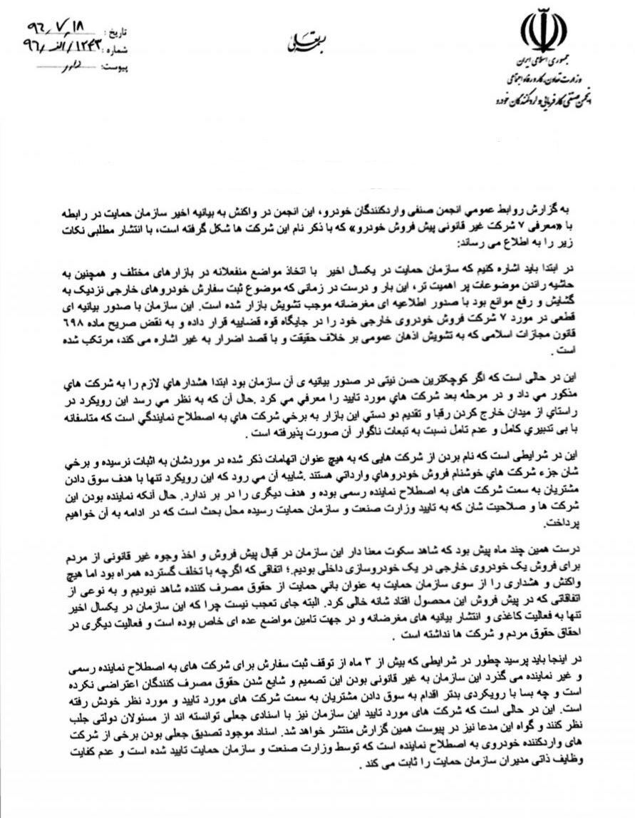 در ابتدا باید اشاره کنیم که سازمان حمایت در یکسال اخیر با اتخاذ مواضع منفعلانه در بازارهای مختلف و همچنین به حاشیه راندن موضوعات پر اهمیت تر، این بار و درست در زمانی که موضوع ثبت سفارش خودروهای خارجی نزدیک به گشایش و رفع موانع بود با صدور اطلاعیهای مغرضانه موجب تشویش بازار شده است. این سازمان با صدور بیانیهای قطعی در مورد 7 شرکت فروش خودروی خارجی خود را در جایگاه قوه قضاییه قرار داده و به نقض صریح ماده 698 قانون مجازات اسلامی که به تشویش اذهان عمومی بر خلاف حقیقت و با قصد اضرار به غیر اشاره می کند، مرتکب شده است.
