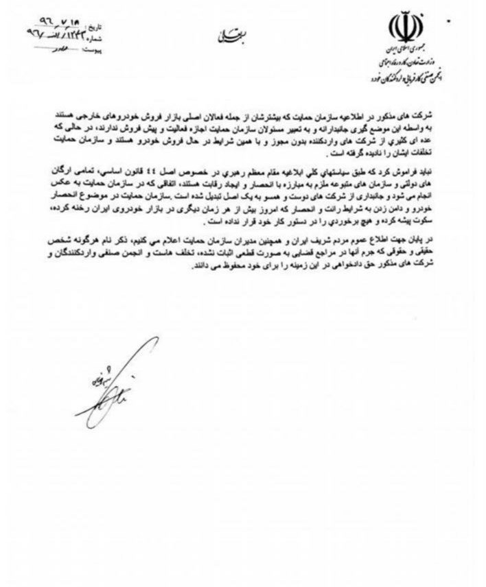 در پایان جهت اطلاع عموم مردم شریف ایران و همچنین مدیران سازمان حمایت اعلام می کنیم، ذکر نام هرگونه شخص حقیقی و حقوقی که جرم آنها در مراجع قضایی به صورت قطعی اثبات نشده، تخلف هاست و انجمن صنفی واردکنندگان و شرکت های مذکور حق دادخواهی در این زمینه را برای خود محفوظ می دانند.