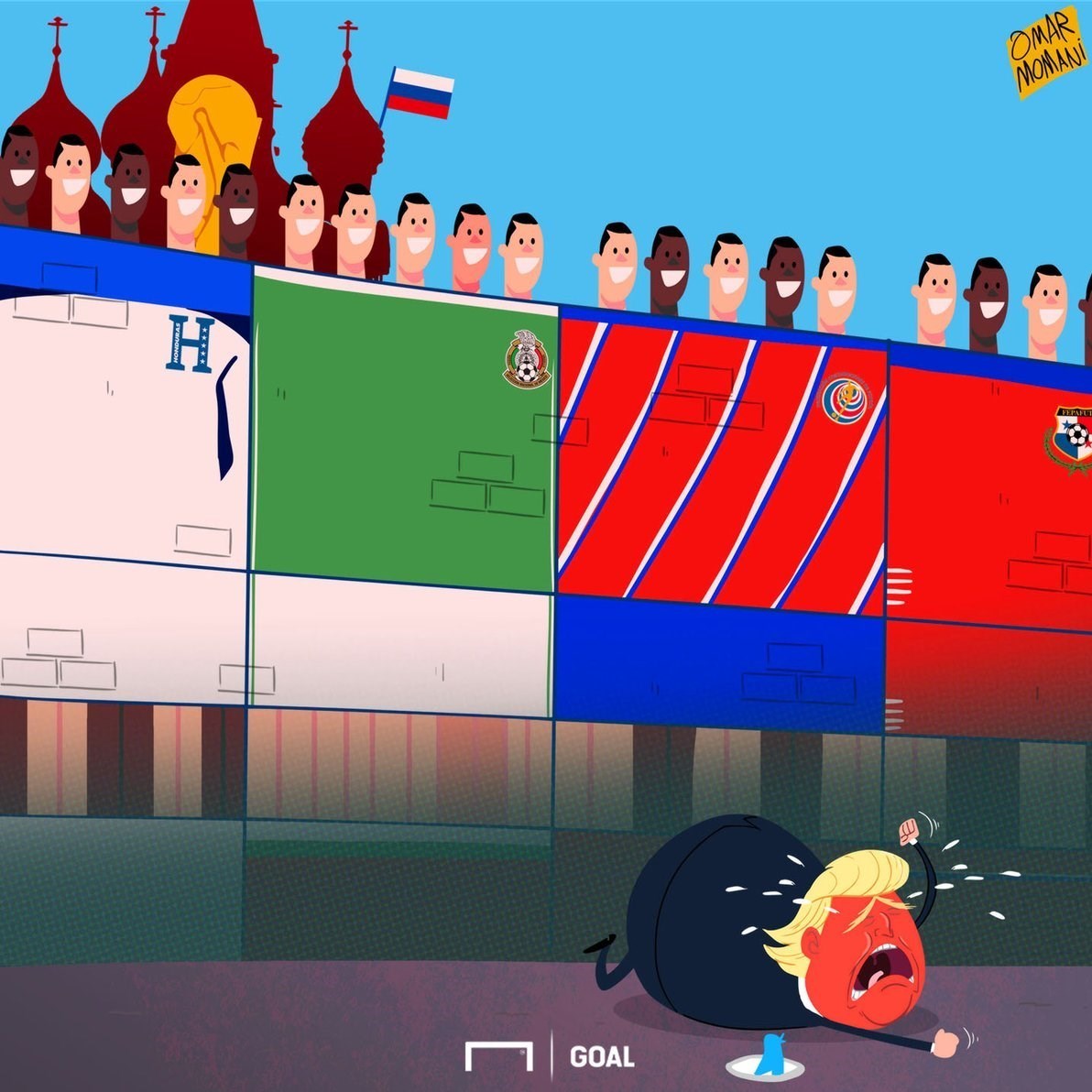 عمر مومنی، کاریکاتوریست سرشناس سایت «گل» در تازهترین کاریکاتور خود ناکامی تیم ملی آمریکا را به شکلی جالب به تصویر کشیده است. او در کاریکاتور خود دونالد ترامپ، رئیس جمهوری ایالات متحده را که سیاستهای خصمانهای علیه برخی کشورهای جهان از جمله همسایگانش دارد را به تصویر کشیده که پشت دیوار روسیه و جام جهانی مانده است، آن هم دیواری که چهار کشور مکزیک، کاستاریکا، پاناما و هندوراس از منطقه کونکاکاف آن را شکل دادهاند.
