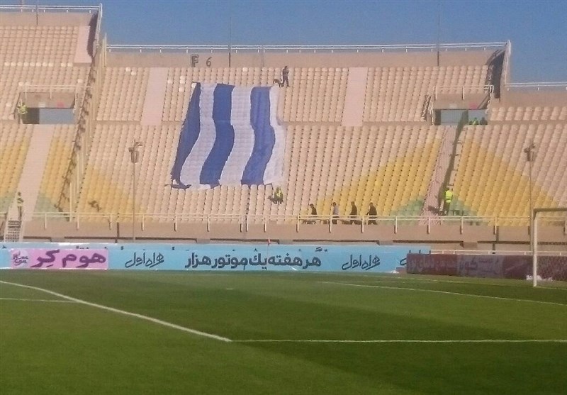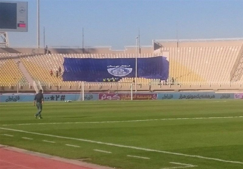 *لیدرهای باشگاه استقلال خوزستان دو پرچم بزرگ آبی در جایگاه تماشاگران این تیم نصب کردهاند. جالب اینجاست که این جایگاهها در حال حاضر خالی از تماشاگر است و فقط پرچم بهروی آن دیده میشود.