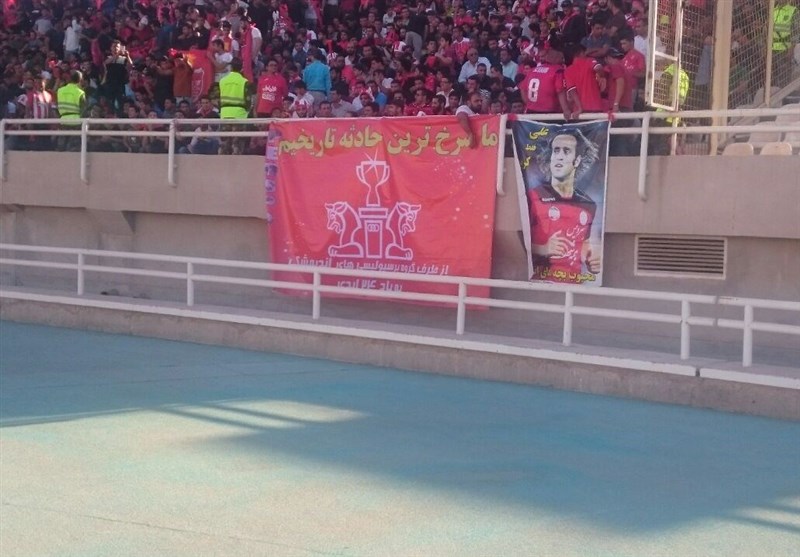 *بین هواداران پرسپولیس بنر بزرگی از علی کریمی دیده میشود که هواداران اندیمشکی آن را تقدیم به کاپیتان پیشین تیم محبوبشان کردند.