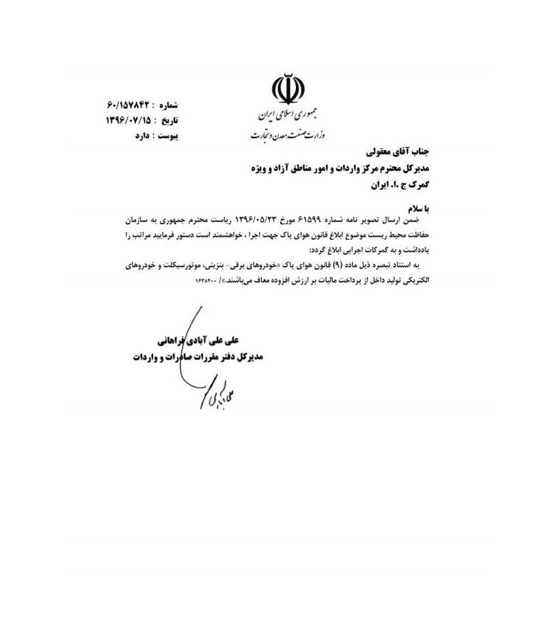 به استناد تبصره ذیل ماده (9) قانون هوای پاک «خودروهای برقی- بنزینی، موتور سیکلت و خودروهای الکتریکی تولید داخل از پرداخت مالیات بر ارزش افزوده معاف میباشند.»