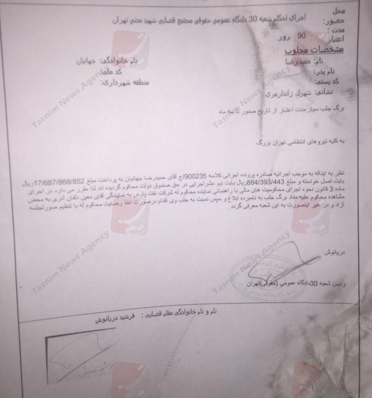 این بدهی مربوط به شرکت نفت پارس است که گویا جهانیان به عنوان مدیر شرکت نفت طلاییه به آنها بدهکار است. در تصویر زیر حکم جلب جهانیان را میبینید: