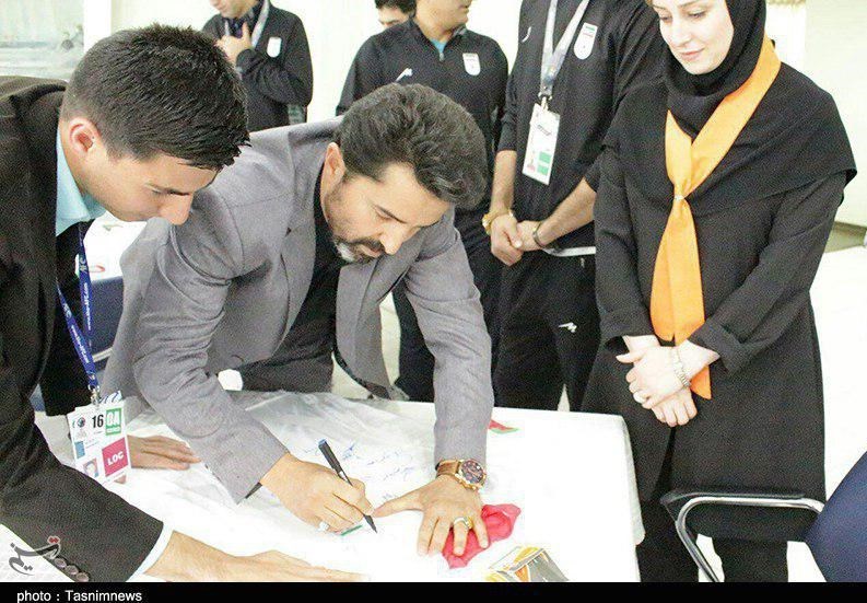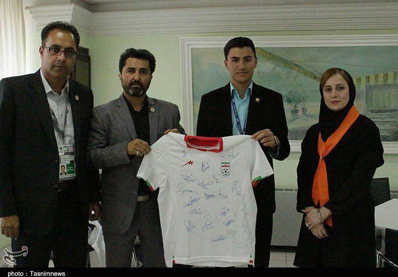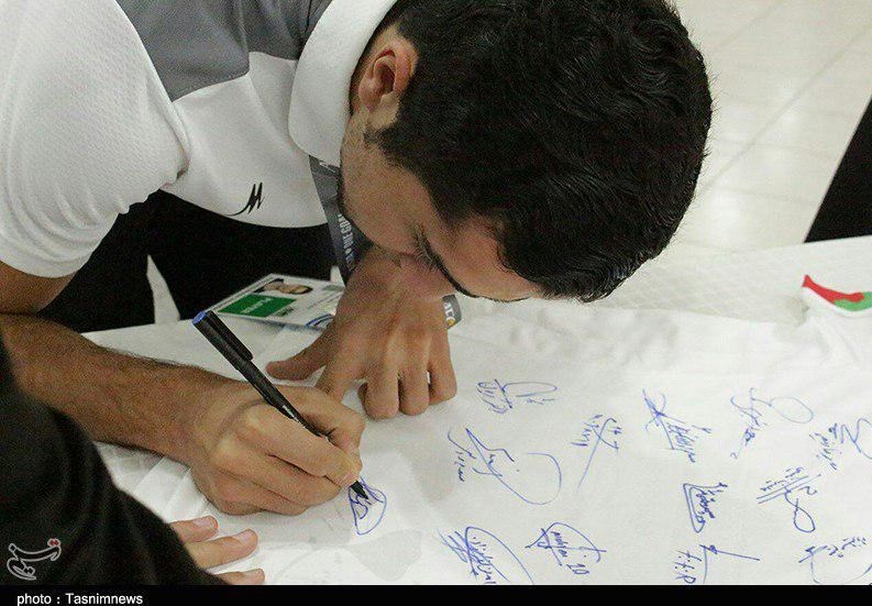 در مراسم اهدا این پیراهن که مقرر شده با قیمت پایه 80 میلیون ریال به مزایده گذاشته شود، ابوالفضل کریمیان مدیر تیم ملی فوتسال، سید محمد ناظمالشریعه، سرمربی و اصغر حسنزاده کاپیتان تیم ملی فوتسال ایران به همراه فرزاد رضاوند (بانی امضاء و اهدا پیراهن) و نماینده بنیاد نیکوکاری دستهای مهربان حضور داشتند.
