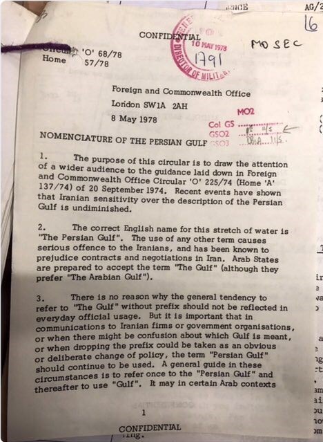 به گزارش گروه سیاست خارجی خبرگزاری تسنیم، حمید بعیدی نژاد سفیر ایران در انگلیس طی مطلبی با اشاره به اسناد منتشر شده از سوی وزارت خارجه انگلیس برای استفاده از عبارت خلیج فارس در نامه نگاریهای رسمی آورده است: مجید تفرشی که از محققین برجسته اسناد تاریخ ایران بویژه اسناد محرمانهای که از آرشیو محرمانه وزارت خارجه انگلستان خارج میشوند، است، اخیراً به سند محرمانهای که حاوی دستورالعمل وزارت خارجه انگلستان به مقامات رسمی آن کشور در خصوص بکارگیری نام صحیح "خلیج فارس" میباشد، اشاره کرده که در تاریخ هشتم مه ١٩٧٨/ ١٨ اردیبهشت ١٣٥٧ صادر شده است. این سند در خصوص بکارگیری نام صحیح خلیج فارس است و طی آن، دستورالعمل لازم به مقامات این کشور در خصوص بکارگیری نام صحیح این قلمرو آبی با در نظر گرفتن شرایط سیاسی روابط این کشور با کشورهای عربی از یکطرف و حساسیت جدی مردم ایران صادر شده که بنظر میرسد امروز هم بر همان سیاق عمل میشود.
