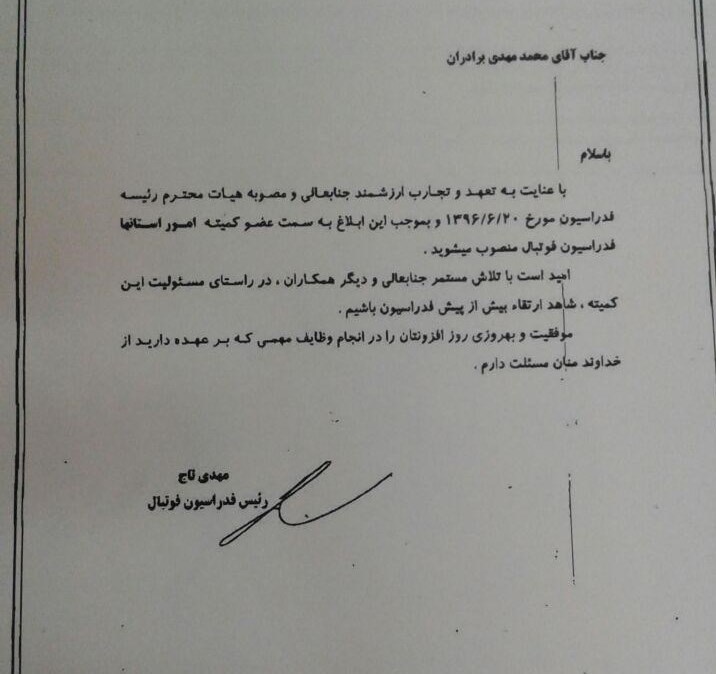 براساس حکم مهدی تاج، مهدی برادران به عنوان عضو کمیته امور استانهای فدراسیون فوتبال جمهوری اسلامی ایران منصوب شده است.
