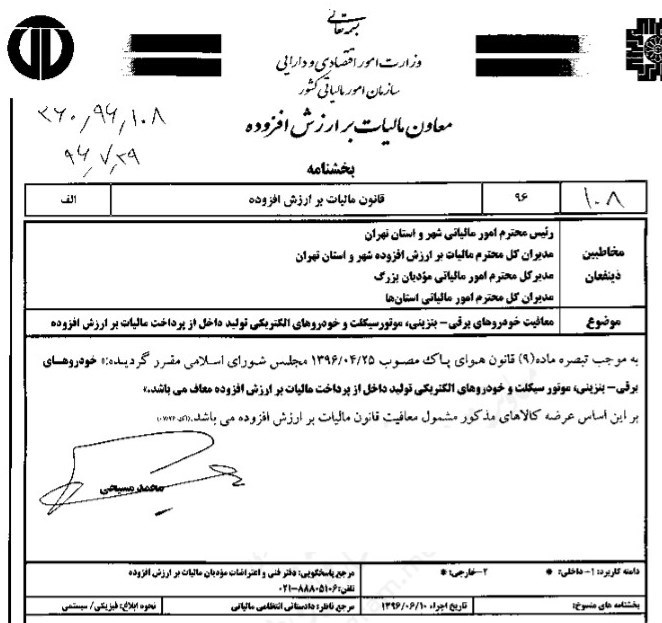 در این بخشنامه آمده است، بهموجب تبصره 9 قانون هوای پاک، انواع خودروهای برقی بنزینی و موتورسیکلتهای الکتریکی تولید داخل از پرداخت مالیات بر ارزش افزوده معاف شدند.