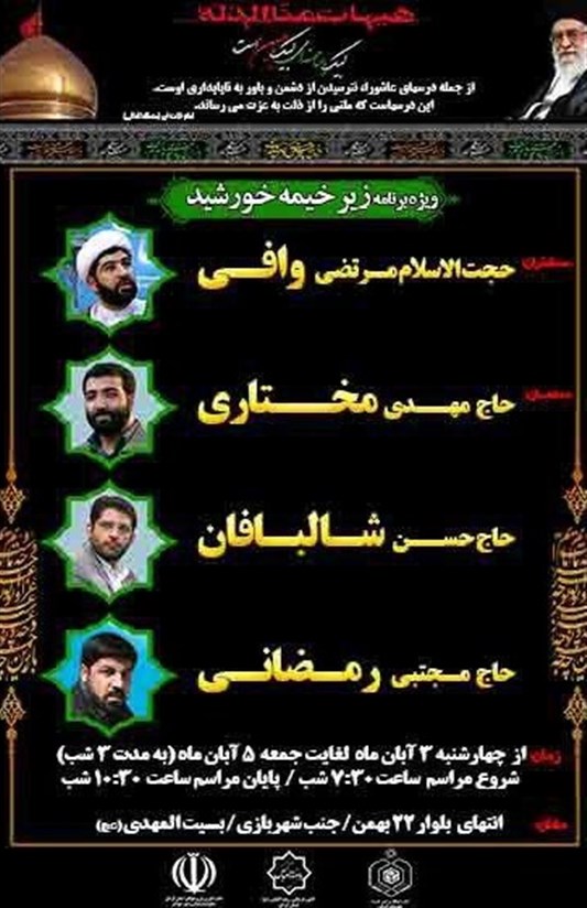 دبیر مجموعه فرهنگی روضهالعباس(ع) کرمان با اشاره به اینکه در ویژه برنامه "زیر خیمه خورشید" حجتالاسلام مرتضی وافی به تبیین و تشریح مسائل دینی و معنوی برای جوانان میپردازد گفت: این مراسم با مداحی مداحان مطرح کشوری از جمله مهدی مختاری، حسن شالبافان و مجتبی رمضانی همراه است.