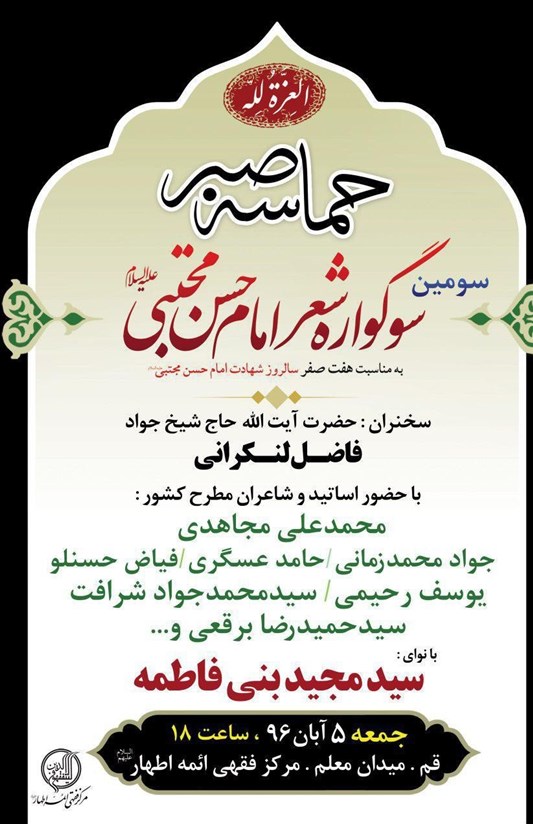 سومین دوره سوگواره شعر امام حسن(ع) روز جمعه، پنجم آبانماه، ساعت 18 برگزار میشود. علاقهمندان میتوانند برای شرکت در این مراسم به مرکز فقهی ائمه اطهار(ع) واقع در قم، میدان معلم مراجعه کنند.