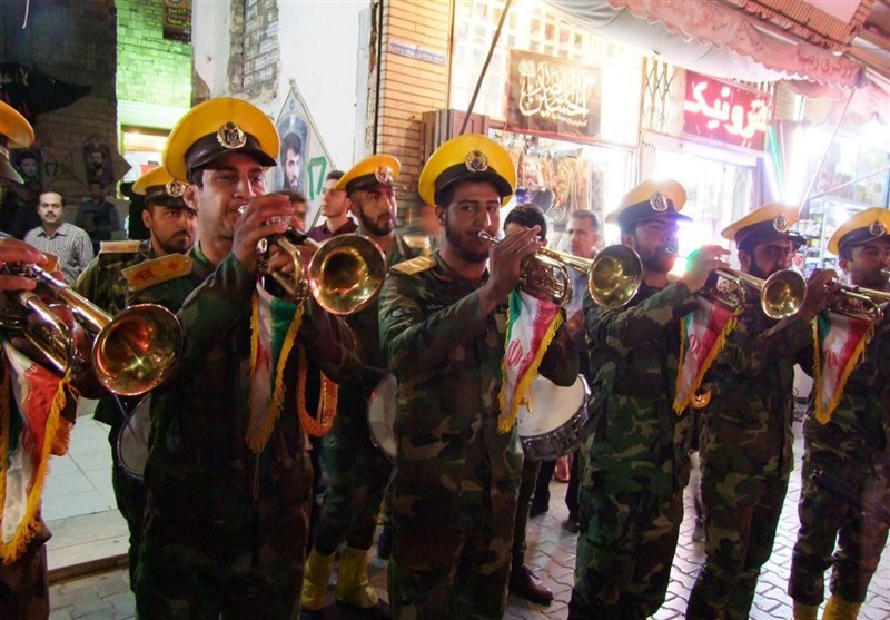 پس از قرائت نماز مغرب و عشا؛ پیکر مطهر شهید توسط تیپ 40 مهندسی رزمی صاحب الزمان(عج) به محل برگزاری مراسم آورده شد و با اجرای گروه موزیک سپاه صاحب الزمان(عج) استان مردم عادی و کسبه خیابان طالقانی و نمازگزاران با تربت و پرچم حرم امام حسین(ع) به استقبال شهید رفتند.