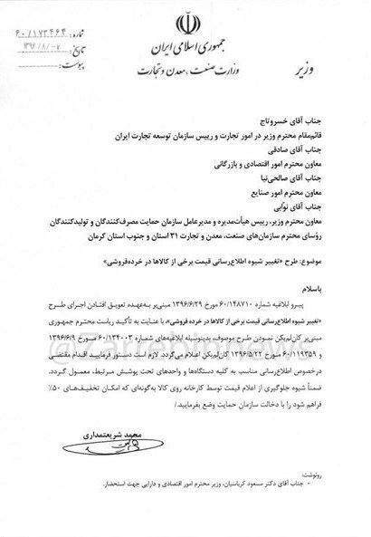در این نامه همچنین، آمده است که شیوه جلوگیری از اعلام قیمت توسط کارخانه روی کالا به گونهای باشد که امکان تخفیفهای 50 درصد با دخالت سازمان حمایت فراهم شود.