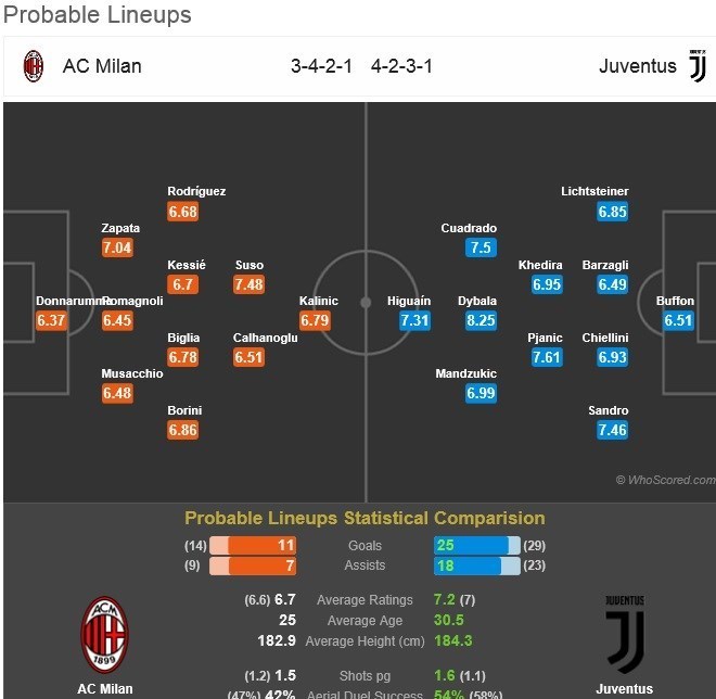 میلان: دوناروما، رومانیولی، زاپاتا، موساکیو، رودریگس، کسیه، بیگلیا، بورینی، سوسو، چالهاناوغلو و کالینیچ