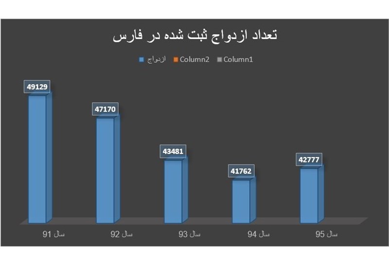 انصاری در تیرماه امسال از ثبت 42 هزار و777 ازدواج و ثبت تعداد 9 هزار و 340 مورد طلاق در سال 95 در استان فارس خبر داده است درواقع نسبت ازدواج به طلاق 4.5 بوده است. نسبت ازدواج به طلاق براساس تعریف ثبت احوال به معنای تعداد ازدواج ثبت شده در برابر یک طلاق است.