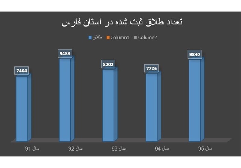 این وضعیت براساس آمار ثبت احوال کشور در استان فارس در 5 سال گذشته روند الاکلنگی داشته است که در 2 نمودار زیر نشان داده شده است، اما در سال 94 نسبت ازدواج به طلاق 5.4، در سال 93 این میزان 5.3، این موضوع در سال 92، 5 و در سال 91 نسبت ازدواج به طلاق نیز 6.6 ثبت شده که بیشترین میزان این نسبت را در سالهای 91 تا 95 داشته است.